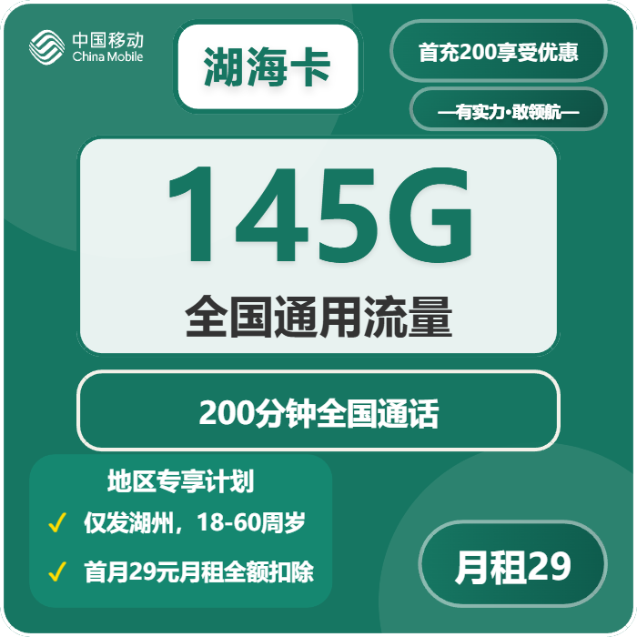 26)移动湖海卡29元包145G通用+200分钟通话,合约24个月,归属地湖州,办卡年龄18-60周岁,线下派送配送,湖州地区专享, 激活强充, 2年优惠。